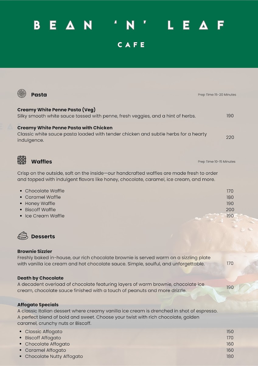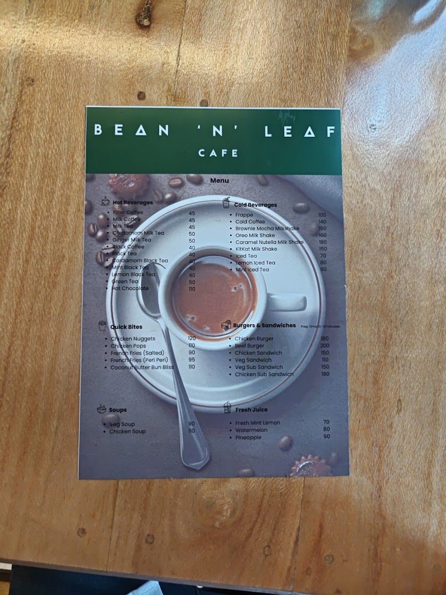 Welcome to BEAN 'N' LEAF Cafe, nestled in the serene surroundings of Kallar, Kerala. This charming cafe is a delightful escape for coffee enthusiasts and casual diners alike. The menu features an array of hot beverages, including rich Filter Coffee and the aromatic Cardamom Milk Tea, inviting you to savor the essence of Kerala in each sip.